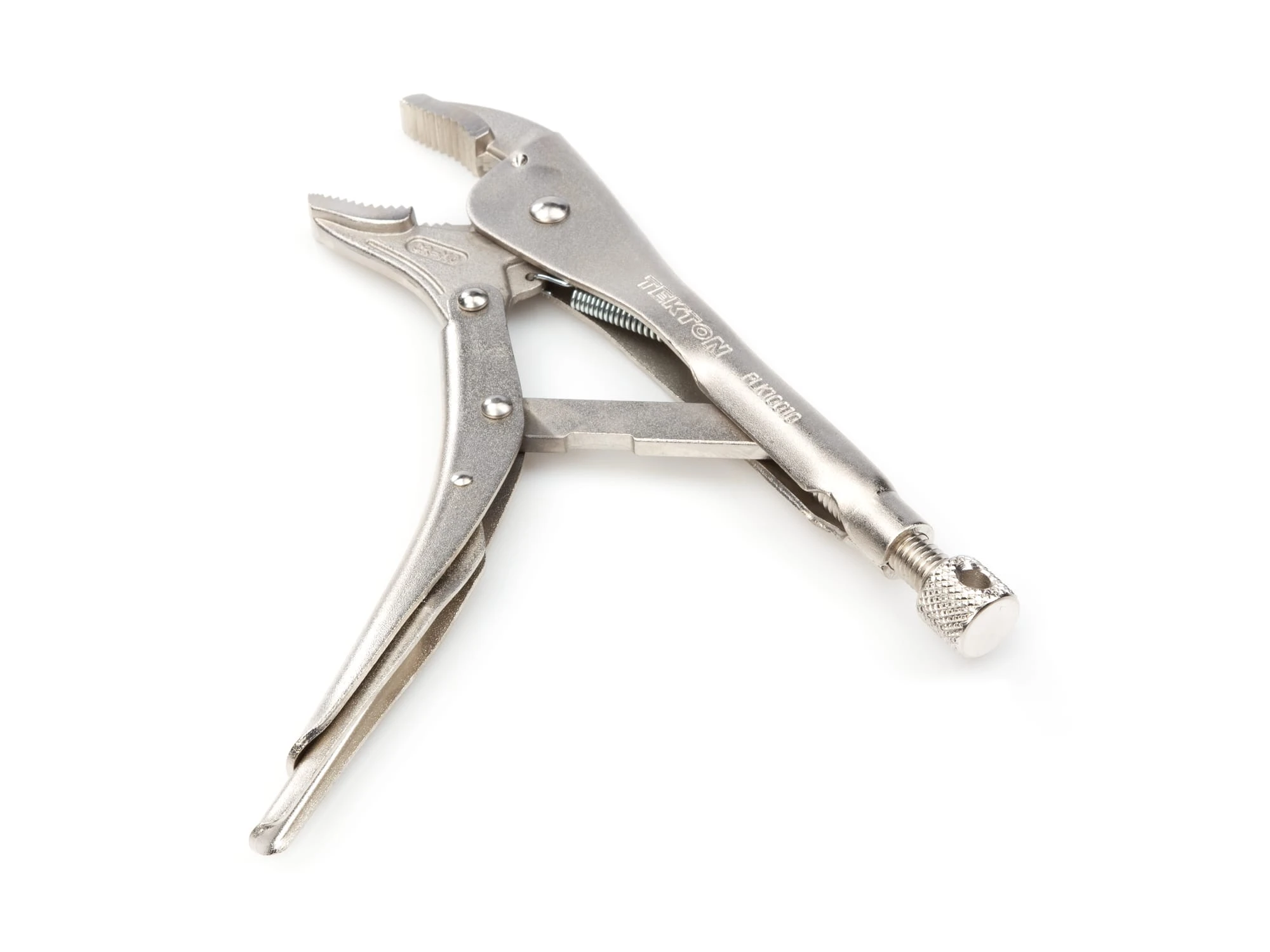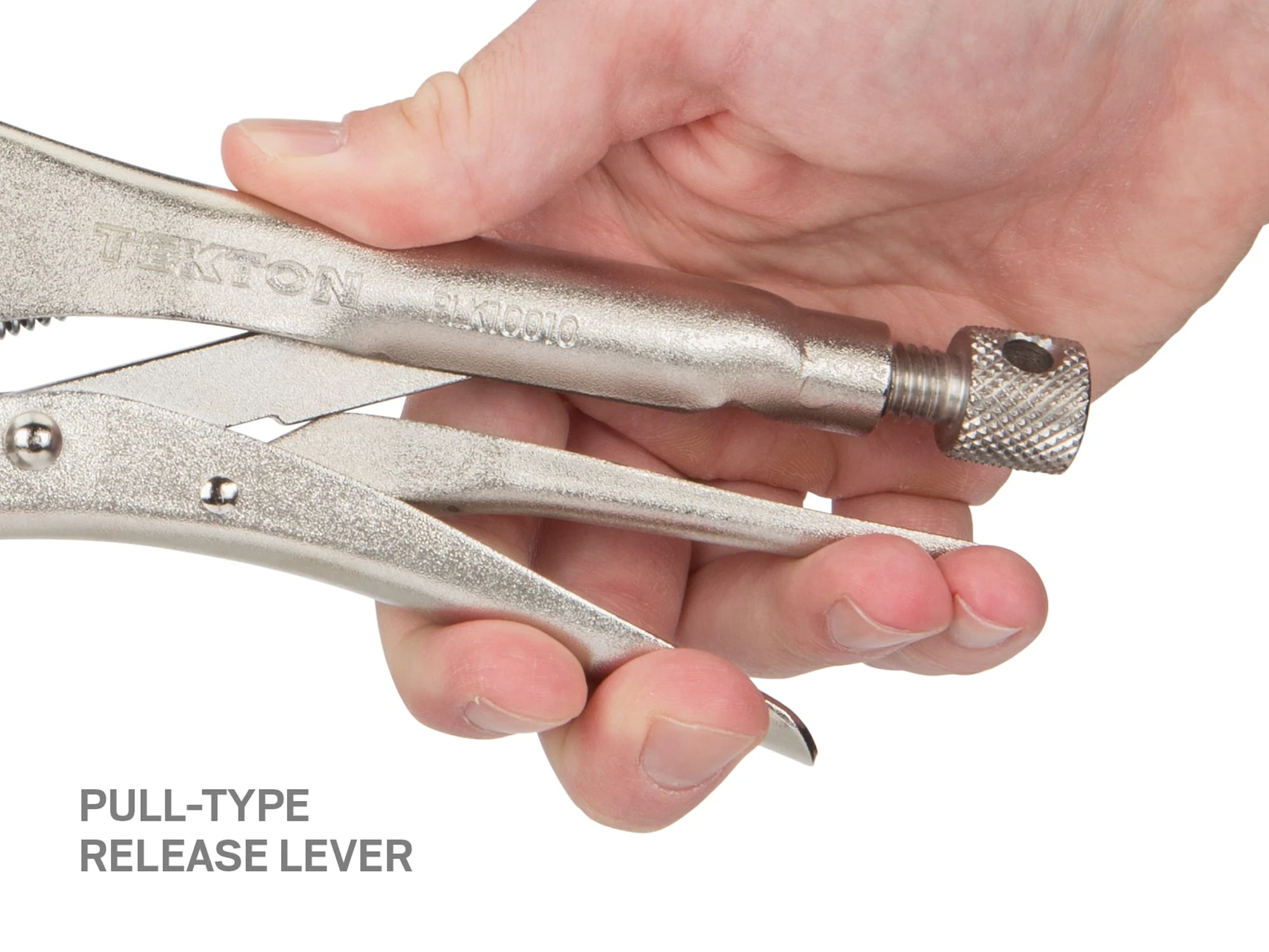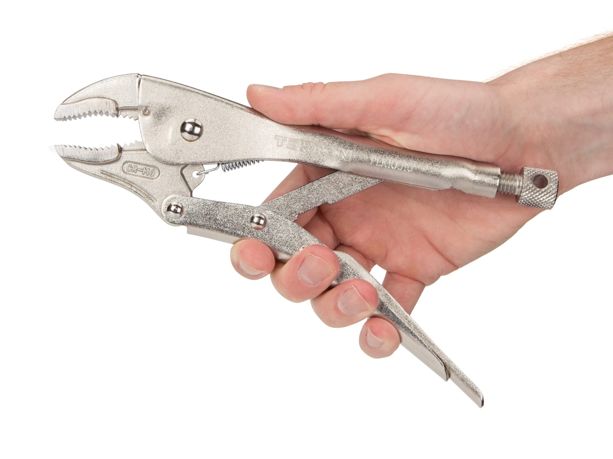 SKU: PLK10010 Categories: Curved Jaw, Locking Pliers, Pliers Tags: 10 inch curved jaw locking pliers. One-hand pull release. Curved jaw, Flat stock, Hex, Sharp teeth. Grips round, Sheet metal. PLK10010., Square, Straight tip