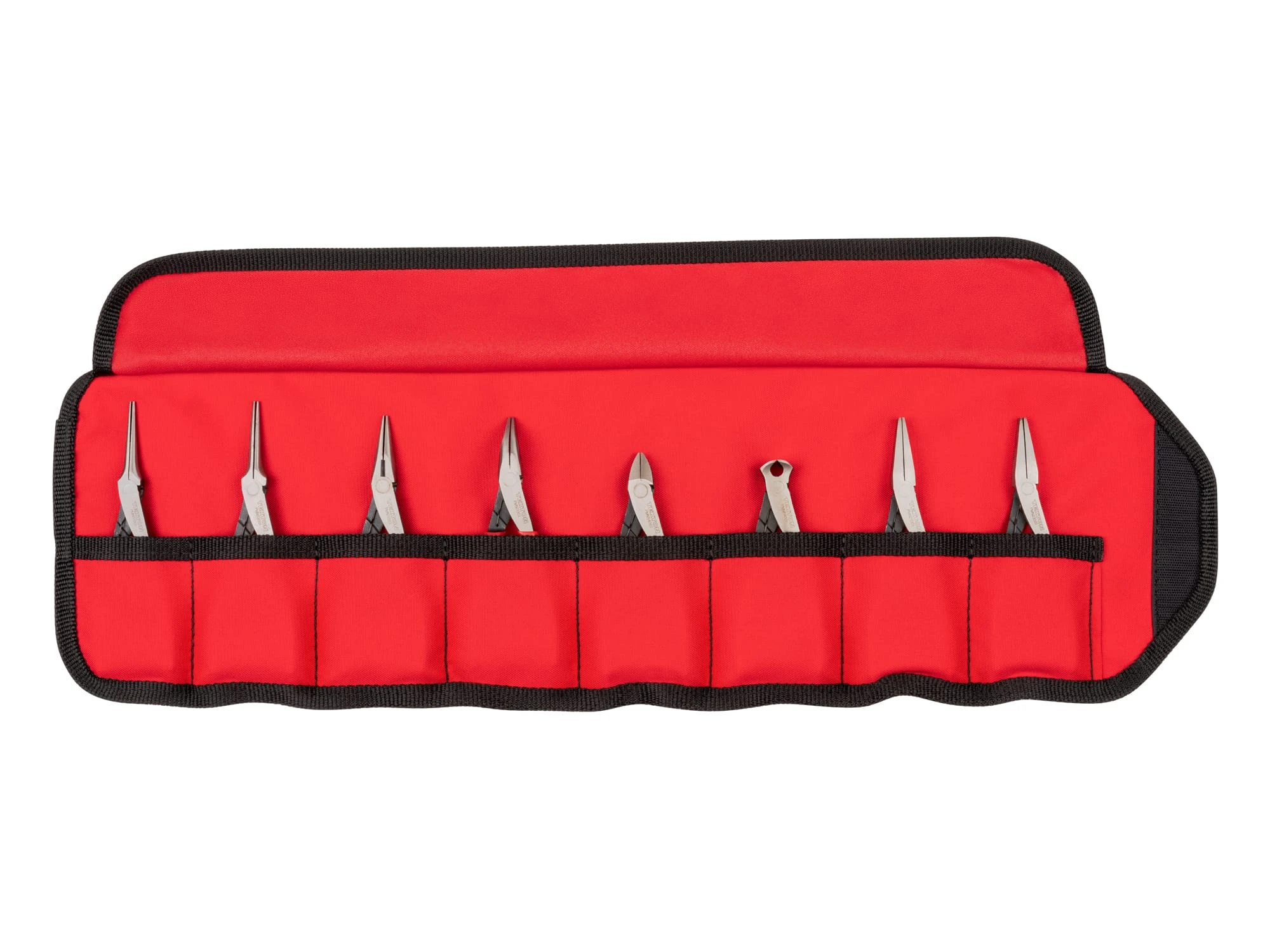 SKU: PMN99910 Categories: Mini Pliers, Pliers Tags: 2 flat nose (smooth and serrated), 2 needle nose (smooth and serrated), And end cutting mini pliers with roll-up pouch storage., Bent nose, Diagonal cutting, Includes: long nose